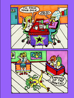 84 pages, 16,50x12,50 cm., offset printed, edition of 1000 Psychedelic office sexploitation gags pressed through a low-fi Lisa Frank filter in a fusion collection from the one-and-only Canadian marker maniac, Bridget Trout.