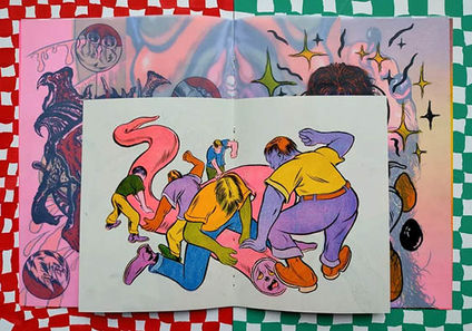 26.5 x 20 cm / 30 pages / staple bound. Risograph printed in Fluorescent Pink, Yellow, Blue and Black ink (transparency-type papers included are laser printed)