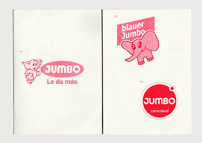 Over the years we started noticing other businesses called Jumbo and the many different ways the name had been visualised. What began as people sending us photos of Jumbo logos they spotted in the wild slowly turned into a collection. This book brings together some of those discoveries, showing how the same name has been interpreted across different places and times. A collection of 137 Jumbo logos from around the world. 21 × 14.8 cm. Printed in one colour using risograph on 100% recycled paper. Staple bound